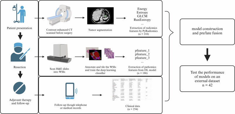 - 开发队列:254例(2019-2022年,中国医科大学第一医院),含术前CE-CT(218例)、术后H&E染色全切片图像(WSI,186例)及临床数据。