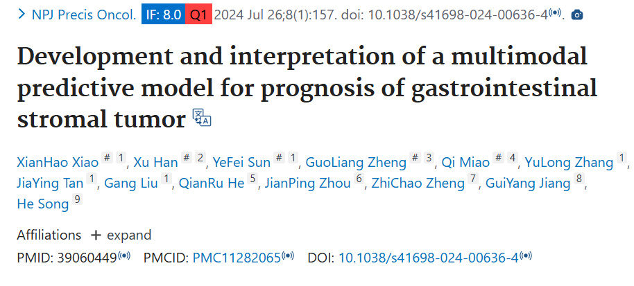 本文发表于《NPJ Precis Oncol》2024年,由中国医科大学等机构团队开展,旨在构建并验证一个多模态预测模型,以更精准预测胃肠道间质瘤(GIST)患者的无复发生存期(RFS),辅助临床决策(如TKI辅助治疗的精准应用)。