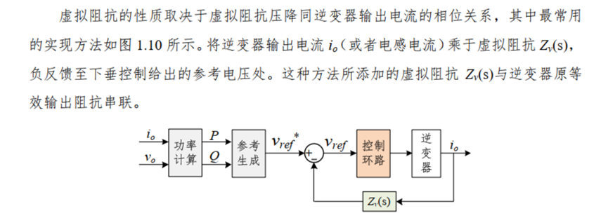 虚拟阻抗法能够实现对逆变器输出阻抗的调节,在基于下垂控制的逆变器并联控制领域具有重要意义。虚拟阻抗的性质取决于虚拟阻抗压降同逆变器输出电流的相位关系,其中最常用的实现方法如图4所示。将逆变器输出电流 io(或者电感电流)乘于虚拟阻抗 Zv(s),负反馈至下垂控制给出的参考电压处。这种方法所添加的虚拟阻抗 Zv(s)与逆变器原等效输出阻抗串联。固定虚拟阻抗法的具体实现一般步骤为:功率计算 → 下垂控制 → 虚拟阻抗环节 →环路控制。