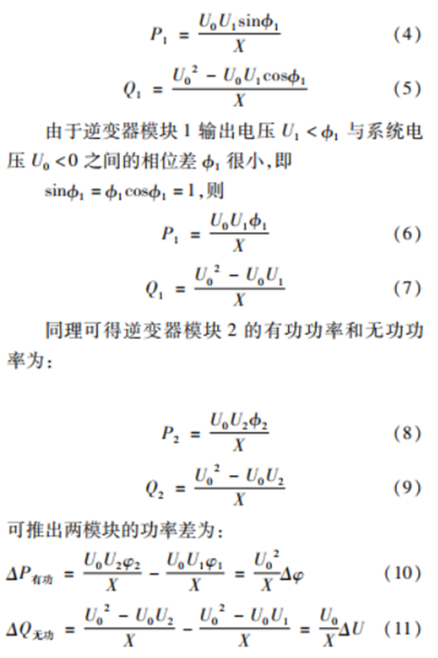 由式(1)、式(2)可得两模块有功功率差主要取决于输出电压相位差,无功功率差主要取决于输出电压幅值差。因此,保证各模块无功功率和有功功率一致,就能确保输出电压幅值和相位一致。反过来说,只要保证输出电压幅值和相位一致,就能保证各模块无功功率和有功功率一致。