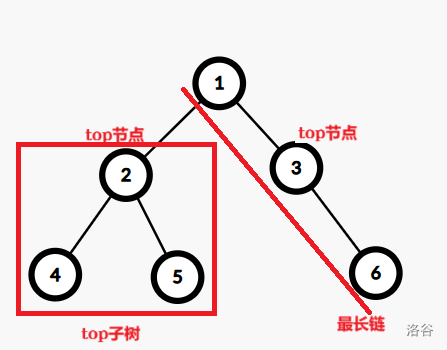 深度为 2 的节点,本文中称为 top 节点,top 节点的子树简称为 top 子树,文中提到的“最长链”“次长链”的一段为根节点。