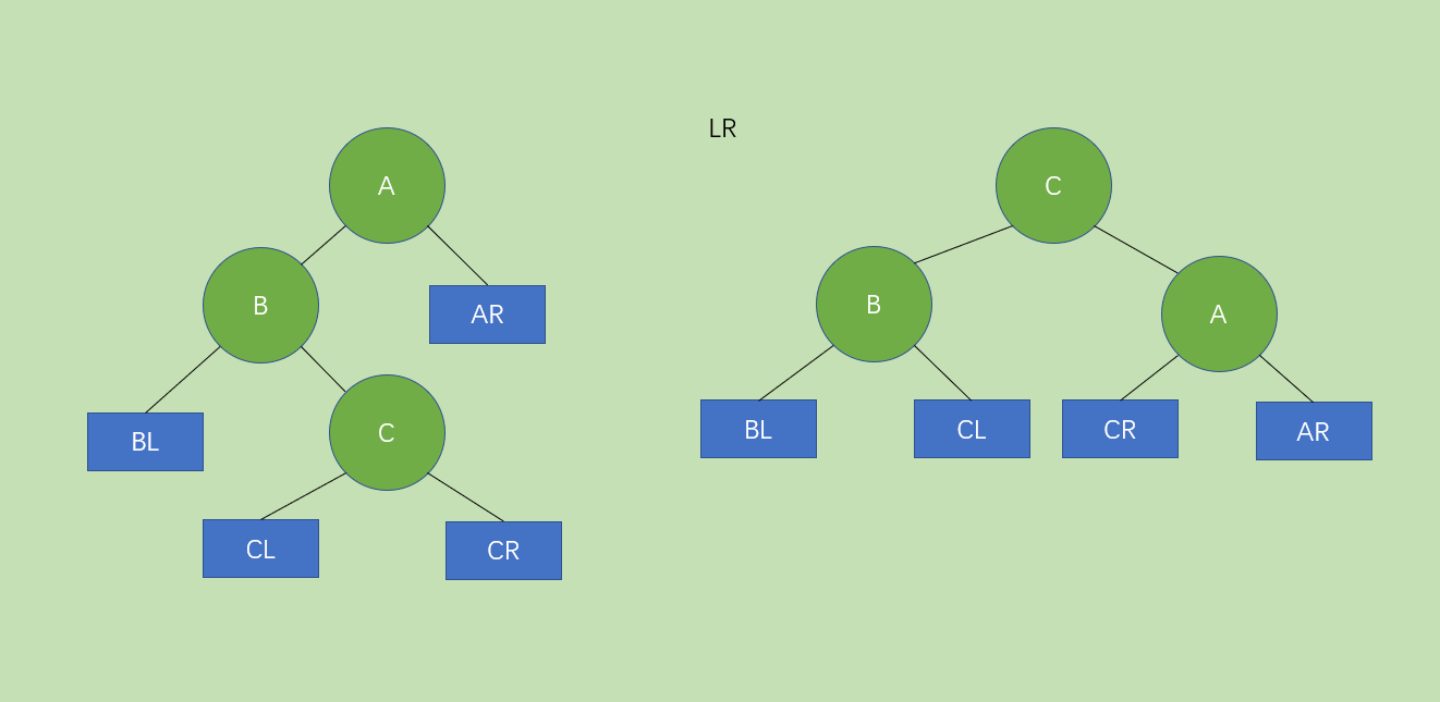 - LR先左后右双旋转:C结点代替A结点成为根结点;B结点带左子树成为C的左孩子,A结点带右子树成为C的右孩子;原来C结点的左子树作为B的右子树,原来C的右子树作为A的左子树。