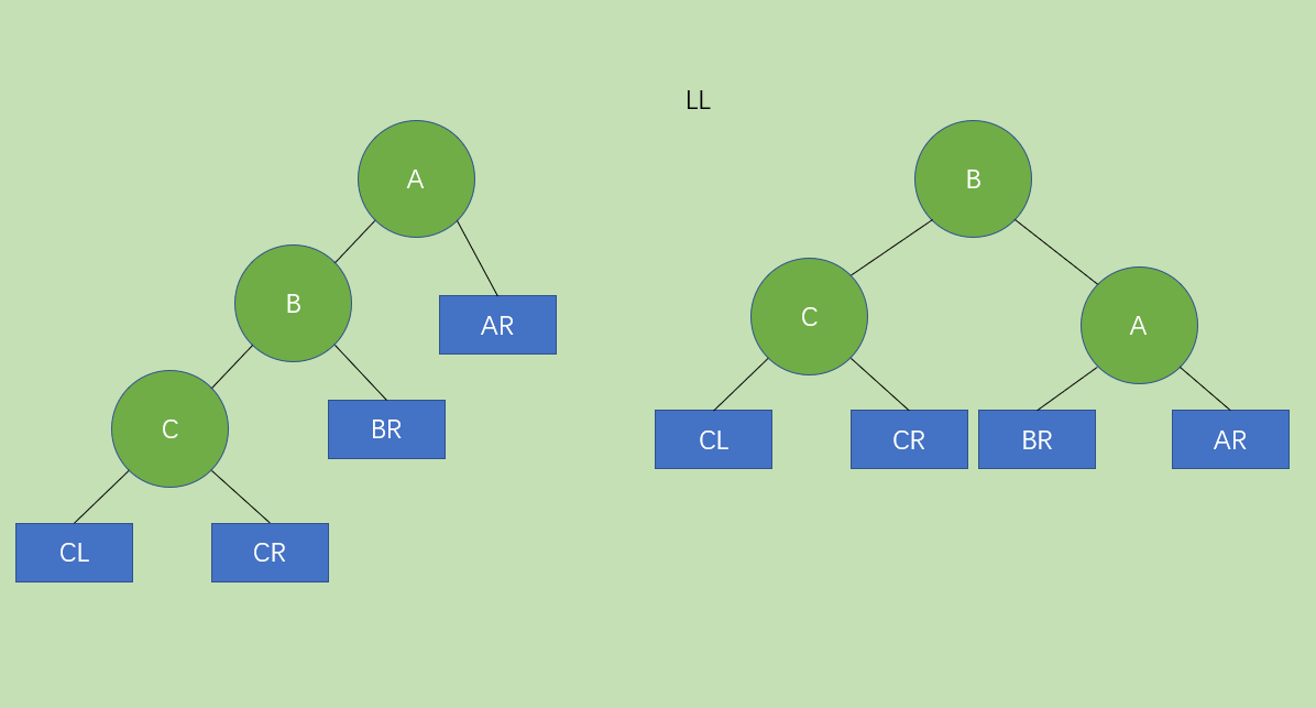 - LL平衡旋转:B结点带左子树代替A成为根结点;A结点带右子树成为B的右子树;B结点原来的右子树作为A的左子树。