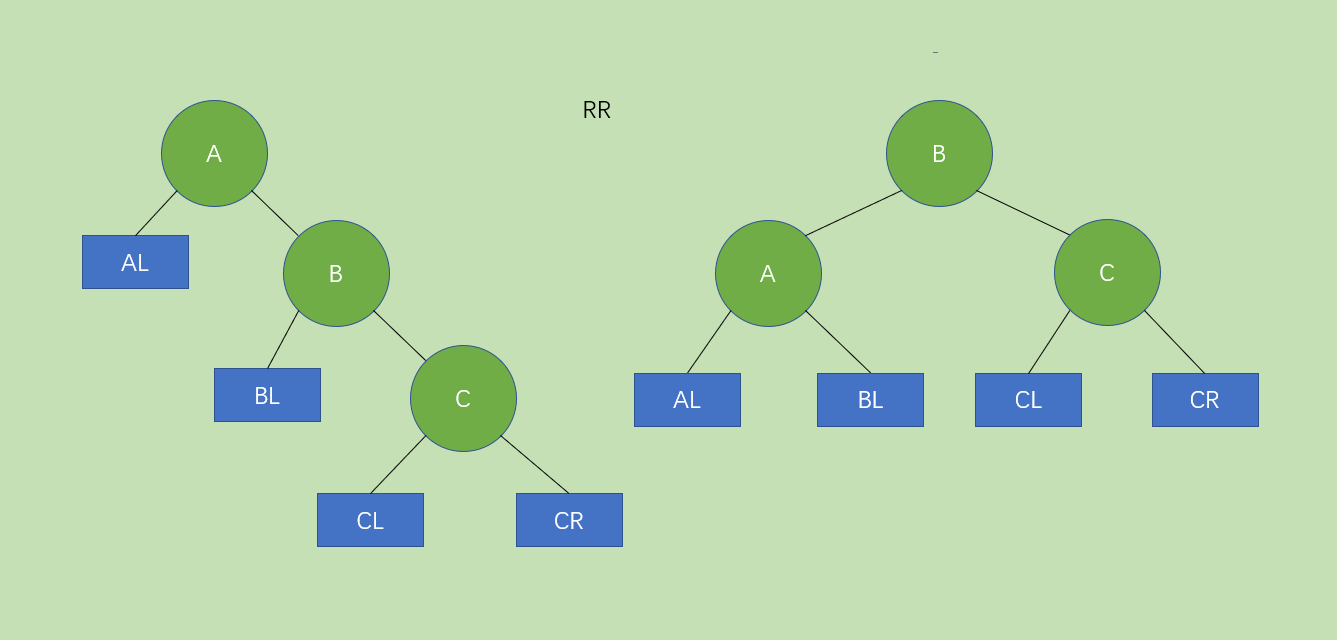 - RR平衡旋转:B结点带右子树代替A成为根结点;A结点带左子树成为B的左子树;B结点原来的左子树作为A的右子树。
