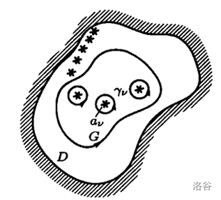 假设函数 \(f\) 在区域 \(D\) 上除了奇点外处处全纯,因此有一个可数的奇点集。设区域 \(G\subseteq D\),\(a_1,\cdots,a_n\) 代表着领域 \(G\) 的奇点,\(\gamma_\nu=\{|z-a_\nu|=r\}\),其中 \(r\) 为充分小的数,使得奇点不相交,令 \(\gamma_\nu\) 逆时针定向,\(G_r=G\setminus \bigcup _{\nu=1}^n \gamma_\nu\)。