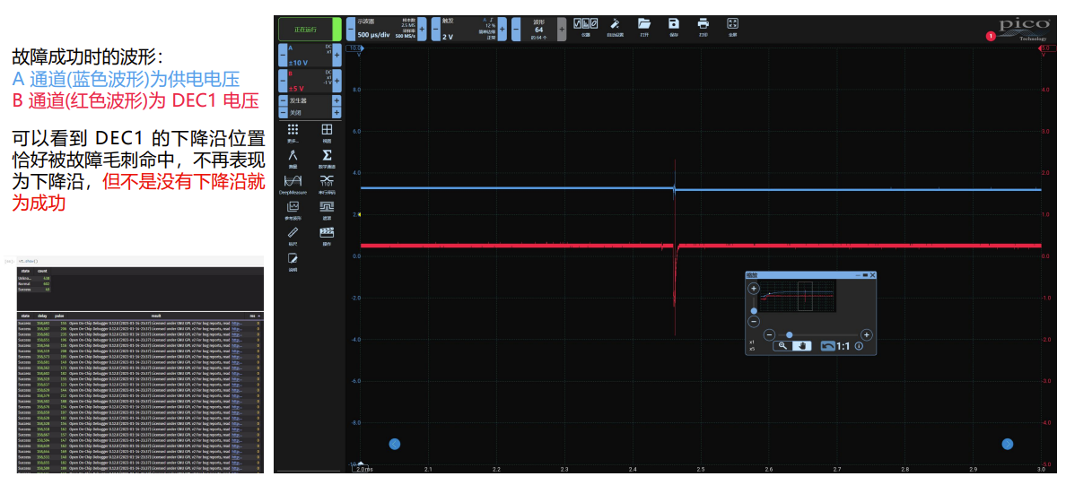 jupyter lab中利用python代码实现故障注入,需要powershell端口、毛刺延时范围、毛刺宽度范围,直到打出如下波形即为成功: