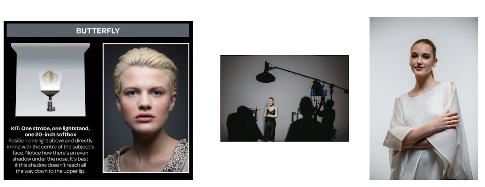 - 蝴蝶光/派拉蒙光:主光源在镜头光轴上方,也就是在人物脸部的正前方,由上向下45°方向投射到人物的面部。在人物鼻子下面形成蝴蝶阴影,多用于女性、证件照。