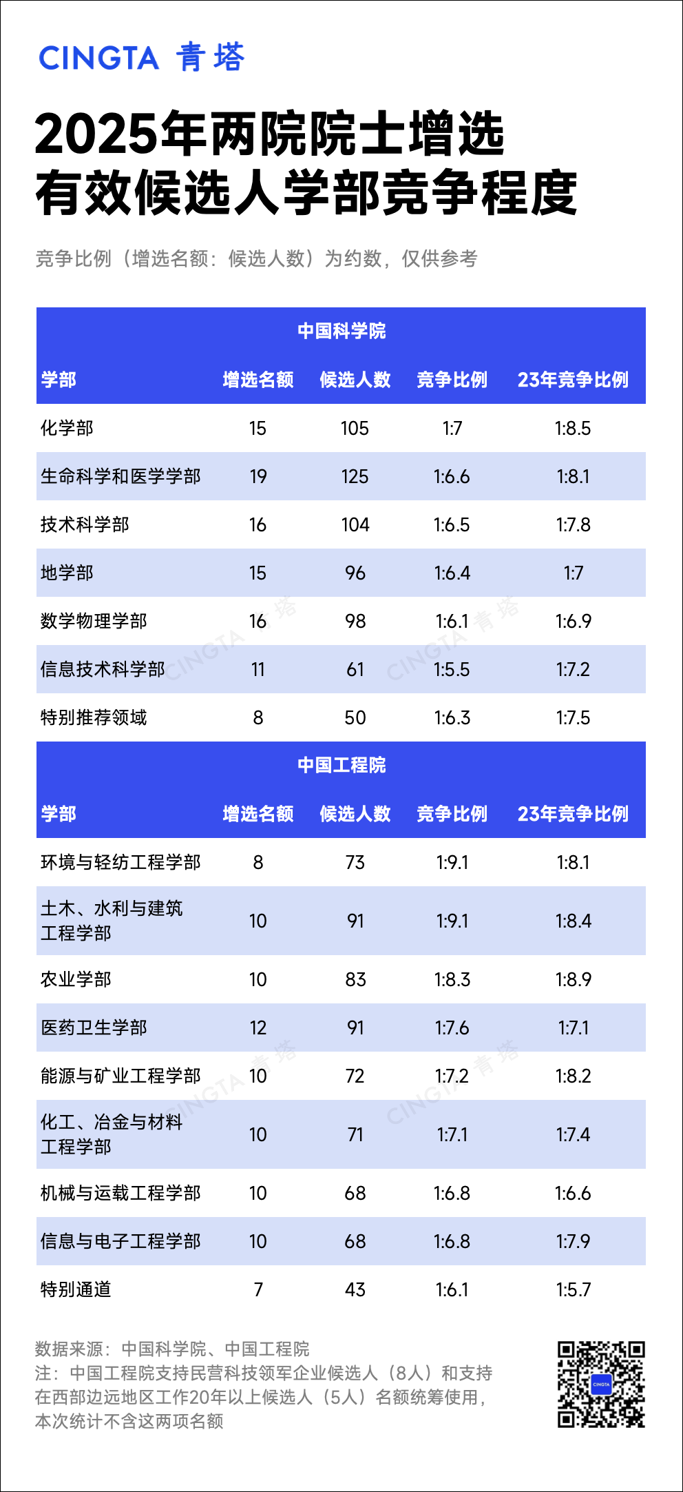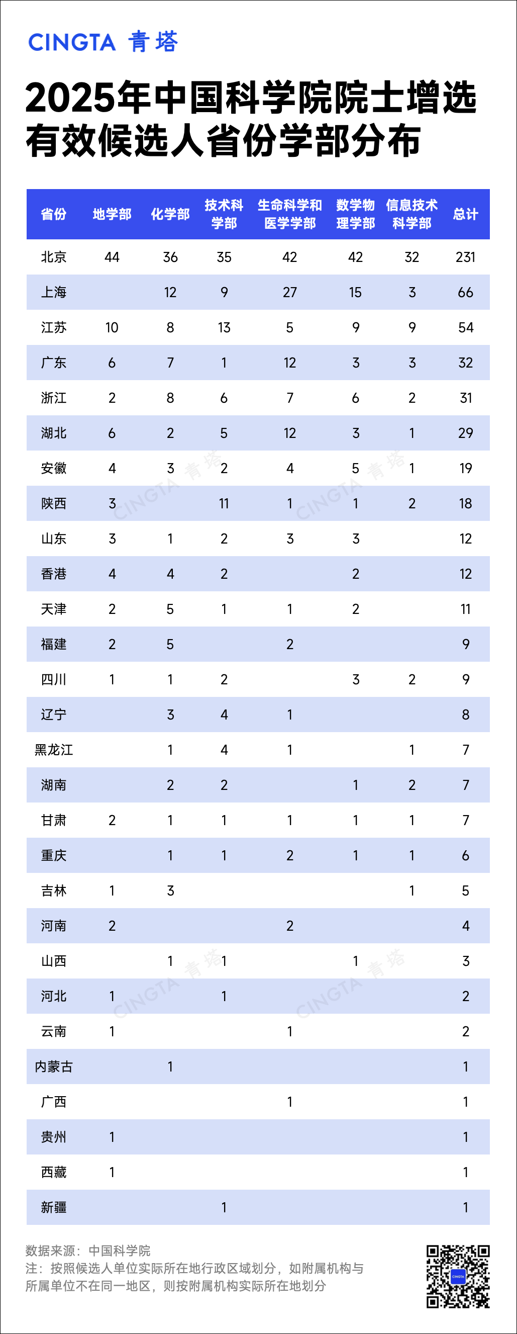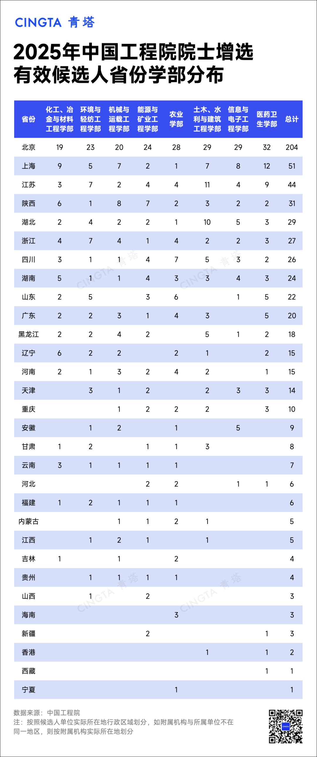 2025年中国科学院与中国工程院增选有效候选人名单已公布,其中中国科学院院士增选有效候选人639人(含特别推荐有效候选人50人),中国工程院院士增选有效候选人660人(含特别通道有效候选人43人)。 院士增选实行按学部分类的评选机制,候选人在其所属学部范围内进行评审与遴选。 因此,青塔将立足学部视角,从竞争态势、省份与高校分布、年龄结构等多个维度,对本次两院院士有效候选人名单进行全方位解读。 工程院竞争更为激烈 从两院有效候选人的学部分布来看,中国科学院的生命科学和医学学部有效候选人数最多,达125人;化学部与技术科学部紧随其后,均超过100人;中国工程院方面,土木、水利与建筑工程学部与医药卫生学部的候选人数量并列领先,各有91人。 通过对比各学部的有效候选人数量与增选名额,可以评估不同学部间的竞争强度。根据2025年两院院士增选指南,中国科学院和中国工程院院士的增选名额,均较2023年有所扩容,达到历史新高。 指南显示,2025年中国科学院院士增选名额不超过100名,较2023年增加了21个名额,学部间的名额分配变化明显。 2025年中国工程院院士增选名额为不超过100名,较2023年增加10名。新增名额主要用于:支持特别通道候选人和在西部边远地区工作20年以上的候选人各增加1名,并首次设立8个名额主要用于支持民营科技领军企业的候选人。各学部之间的名额分配保持不变。 基于此,2025年中国科学院院士增选中,化学部的竞争最为激烈,增选名额与有效候选人数量的比例约为1:7;而信息技术科学部的竞争相对缓和,比例约为1:5.5。 由于本届中国科学院各学部的增选名额均有所增加,整体而言,各学部之间的竞争激烈程度较2023年有所缓解。 中国工程院因各学部增选名额保持不变,整体竞争较2023年更为激烈。其中,环境与轻纺工程学部、土木、水利与建筑工程学部的名额与候选人比例均达到1:9.1;农业学部、医药卫生学部、能源与矿业工程学部、化工、冶金与材料工程学部的竞争比例均高于中国科学院竞争最激烈的学部(1:7);即便在竞争相对缓和的机械与运载学部、信息与电子工程学部,比例也达到了1:6.8。 注:中国工程院支持民营科技领军企业候选人(8人)和支持在西部边远地区工作20年以上候选人(5人)名额统筹使用,本次统计不含这两项名额。 与此同时,从2023年两院院士增选来看,中国科学院实际当选人数仅为计划名额的74.7%,中国工程院实际当选人数约为计划名额的82.2%,当选人数与计划名额之间的缺口为2009年以来历次增选中最大的一次,院士遴选中存在“宁缺毋滥”的严格评审倾向,这也预示着后续增选中候选人的竞争将更为激烈。