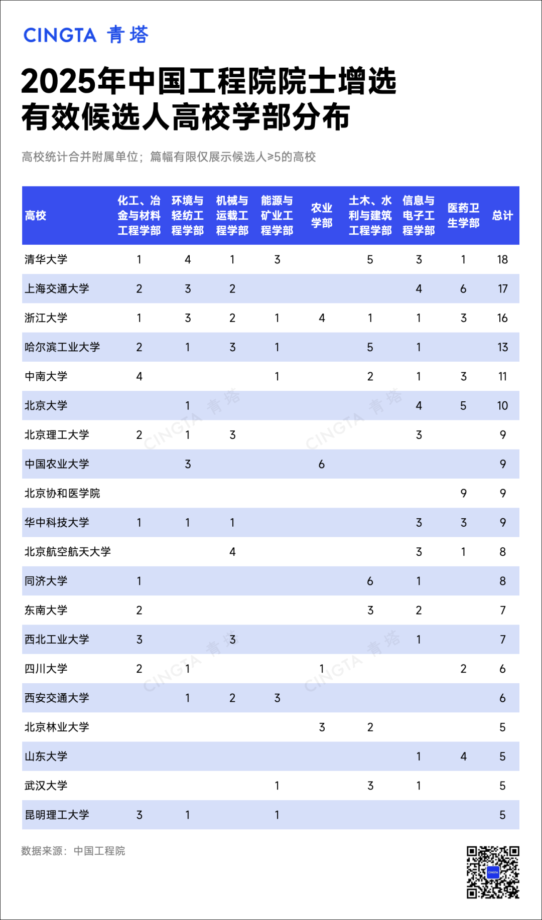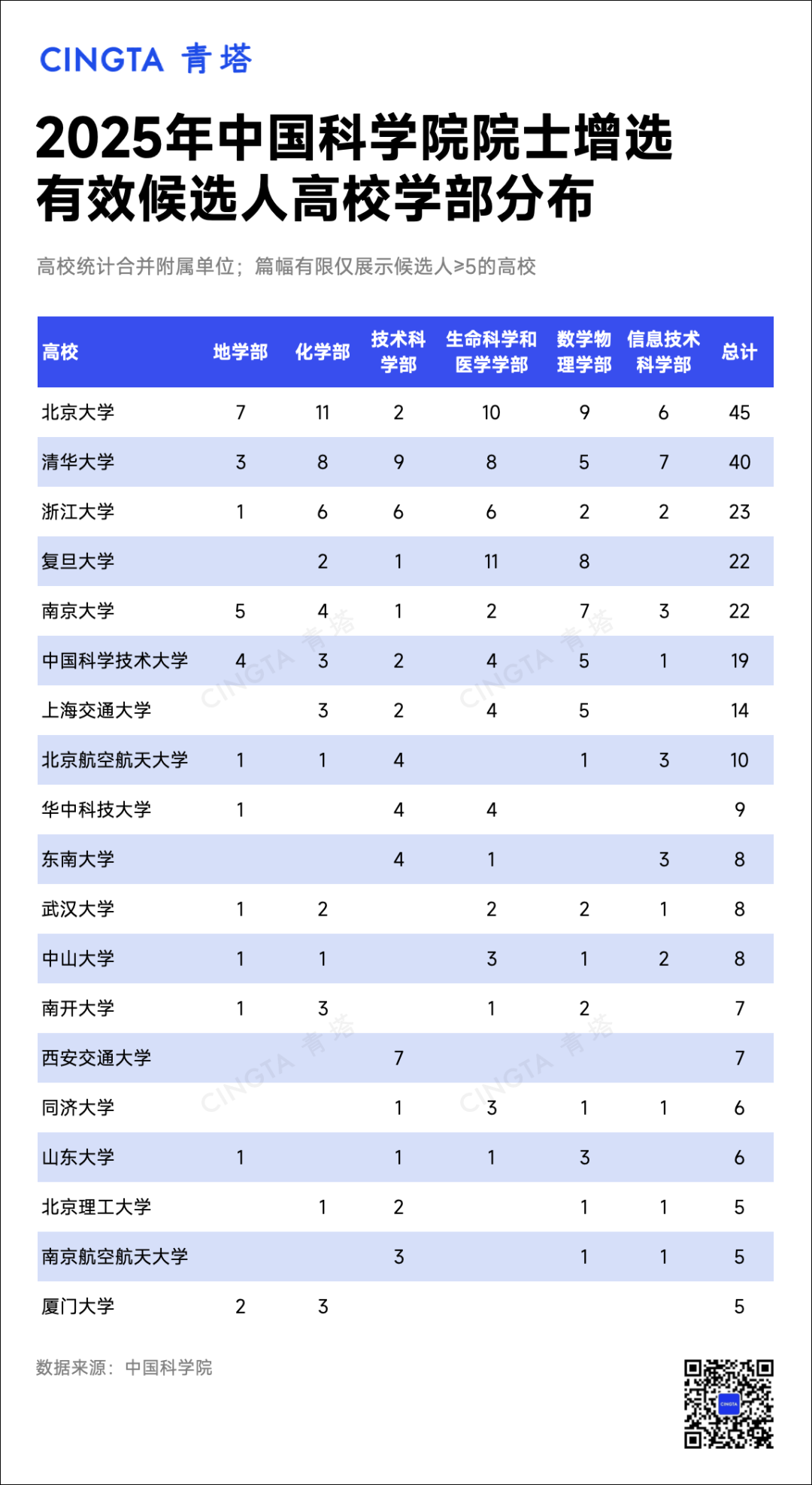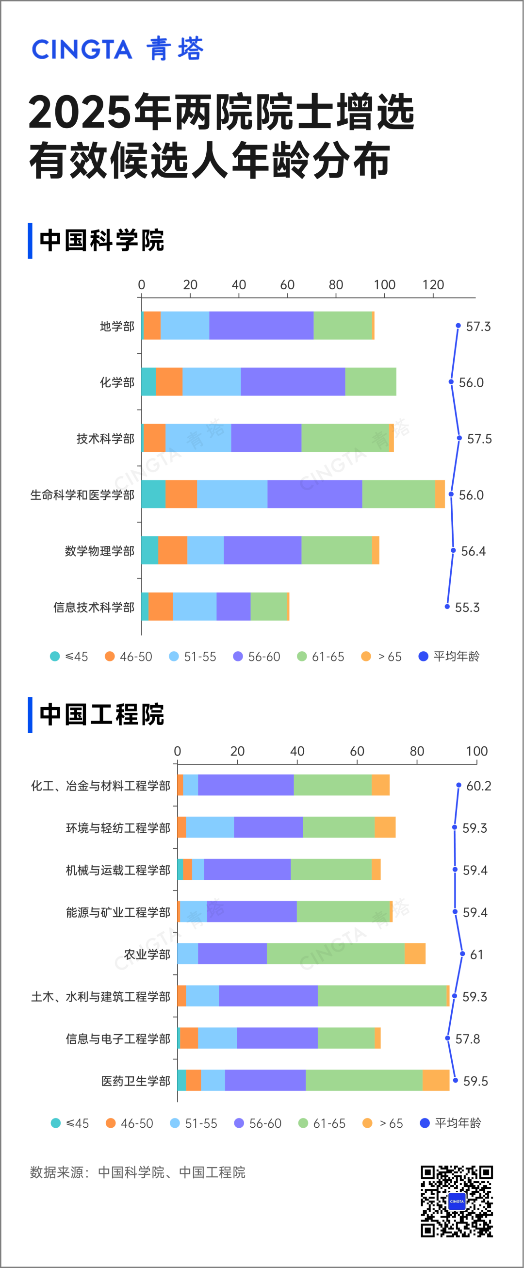 2025年中国科学院与中国工程院增选有效候选人名单已公布,其中中国科学院院士增选有效候选人639人(含特别推荐有效候选人50人),中国工程院院士增选有效候选人660人(含特别通道有效候选人43人)。 院士增选实行按学部分类的评选机制,候选人在其所属学部范围内进行评审与遴选。 因此,青塔将立足学部视角,从竞争态势、省份与高校分布、年龄结构等多个维度,对本次两院院士有效候选人名单进行全方位解读。 工程院竞争更为激烈 从两院有效候选人的学部分布来看,中国科学院的生命科学和医学学部有效候选人数最多,达125人;化学部与技术科学部紧随其后,均超过100人;中国工程院方面,土木、水利与建筑工程学部与医药卫生学部的候选人数量并列领先,各有91人。 通过对比各学部的有效候选人数量与增选名额,可以评估不同学部间的竞争强度。根据2025年两院院士增选指南,中国科学院和中国工程院院士的增选名额,均较2023年有所扩容,达到历史新高。 指南显示,2025年中国科学院院士增选名额不超过100名,较2023年增加了21个名额,学部间的名额分配变化明显。 2025年中国工程院院士增选名额为不超过100名,较2023年增加10名。新增名额主要用于:支持特别通道候选人和在西部边远地区工作20年以上的候选人各增加1名,并首次设立8个名额主要用于支持民营科技领军企业的候选人。各学部之间的名额分配保持不变。 基于此,2025年中国科学院院士增选中,化学部的竞争最为激烈,增选名额与有效候选人数量的比例约为1:7;而信息技术科学部的竞争相对缓和,比例约为1:5.5。 由于本届中国科学院各学部的增选名额均有所增加,整体而言,各学部之间的竞争激烈程度较2023年有所缓解。 中国工程院因各学部增选名额保持不变,整体竞争较2023年更为激烈。其中,环境与轻纺工程学部、土木、水利与建筑工程学部的名额与候选人比例均达到1:9.1;农业学部、医药卫生学部、能源与矿业工程学部、化工、冶金与材料工程学部的竞争比例均高于中国科学院竞争最激烈的学部(1:7);即便在竞争相对缓和的机械与运载学部、信息与电子工程学部,比例也达到了1:6.8。 注:中国工程院支持民营科技领军企业候选人(8人)和支持在西部边远地区工作20年以上候选人(5人)名额统筹使用,本次统计不含这两项名额。 与此同时,从2023年两院院士增选来看,中国科学院实际当选人数仅为计划名额的74.7%,中国工程院实际当选人数约为计划名额的82.2%,当选人数与计划名额之间的缺口为2009年以来历次增选中最大的一次,院士遴选中存在“宁缺毋滥”的严格评审倾向,这也预示着后续增选中候选人的竞争将更为激烈。