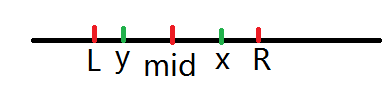 假设我们已经求出了前 \(x-1\) 个信息,并且已经知道了 \(S[l,r]\) 为回文串 \(l\le x\le r\),这可以进一步确认为 \(mid=\frac{l+r}2\le x\le r\)。如下图,\(y\) 为 \(x\) 关于 \(mid\) 的对称位置: