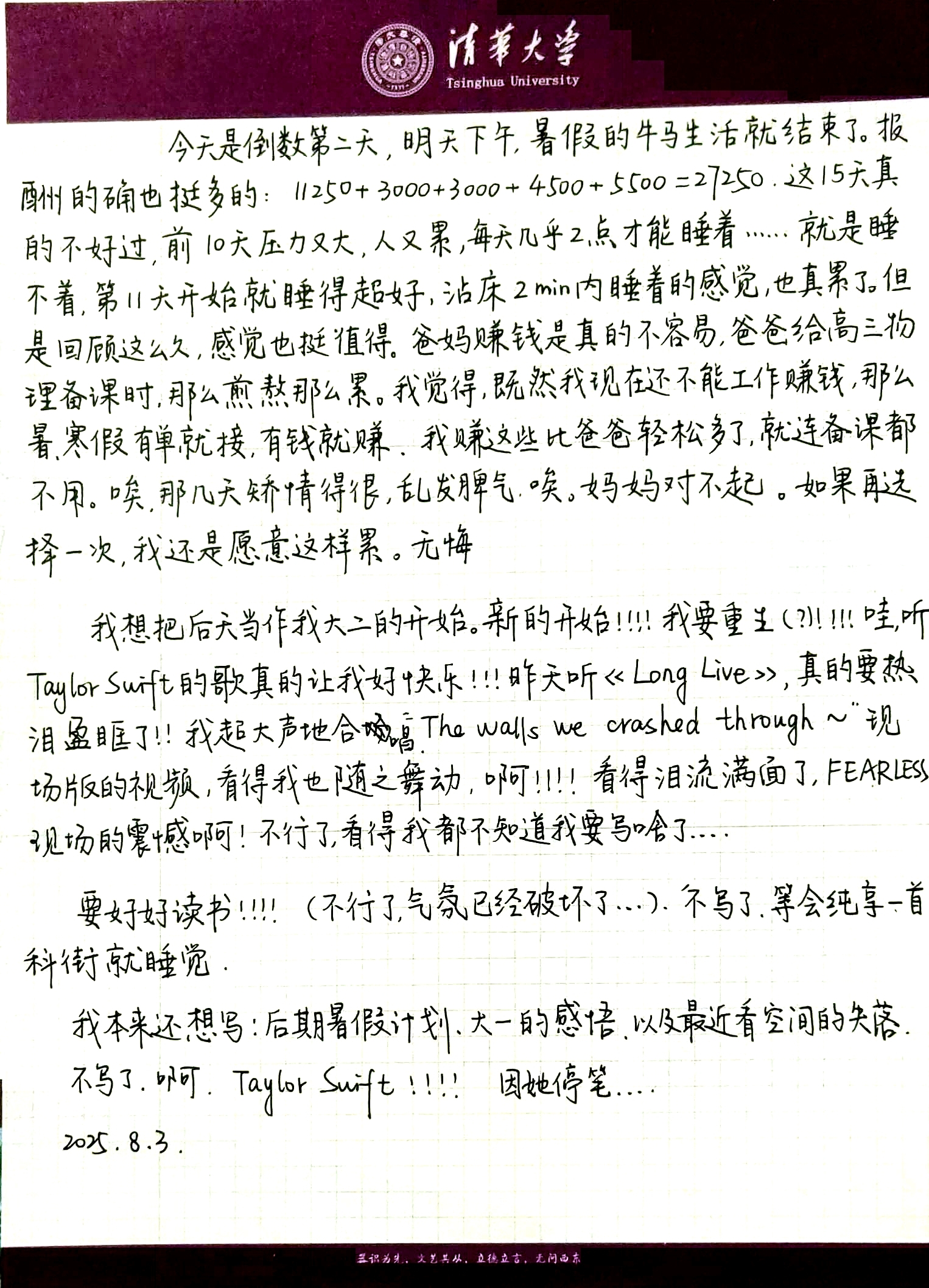 今天是倒数第二天,明天下午.暑假的牛马生活就结束了。报酬的确也挺多的:11250+3000+3000+4500+5500=27250.这15天真的不好过,前10天压力又大,人又累,每天几乎2点才能睡着……就是睡不着,第11天开始就睡得超好,沾床2min内睡着的感觉,也真累了。但是回顾这么久,感觉也挺值得。爸妈赚钱是真的不容易,爸爸给高三物理备课时,那么煎熬那么累。我觉得,既然我现在还不能工作赚钱,那么暑、寒假有单就接,有钱就赚,我赚这些比爸爸轻松多了,就连备课都不用。唉,那几天矫情得很,乱发脾气。唉,妈妈对不起。如果再选择一次,我还是愿意这样累。无悔