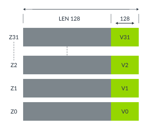 向量寄存器共享。下图展示了可扩展向量寄存器 Z0-Z31