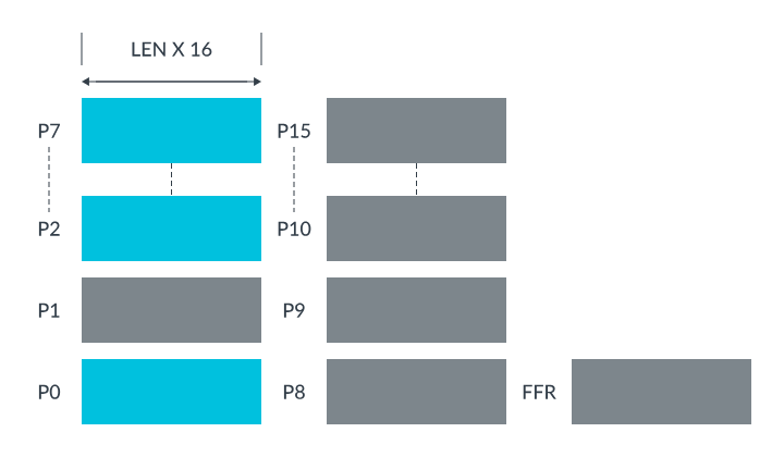 为了控制哪些激活元素参与运算,SVE 指令集中大量使用谓词寄存器作为掩码,这也为向量运算提供了灵活性。下图展示了可扩展谓词寄存器 P0-P15