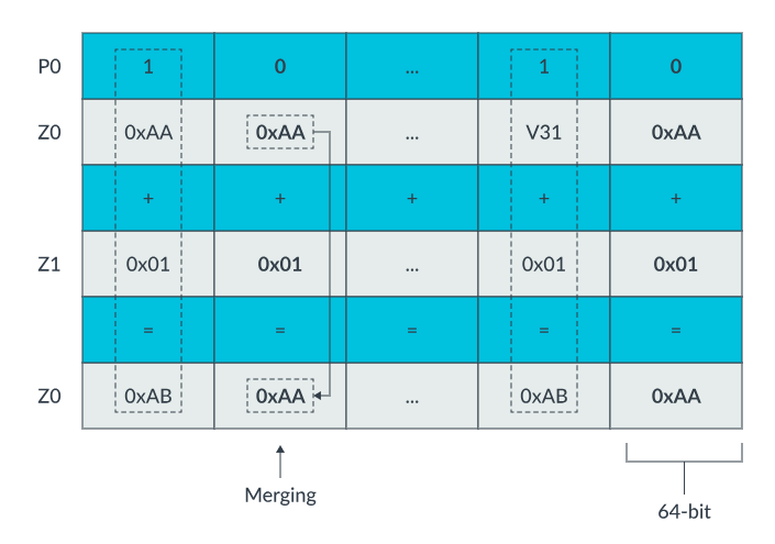 上述指令将激活元素 Z0 和 Z1 相加,并将结果放入 Z0。P0 表示操作数中哪些元素是激活状态和非激活状态。P0 后的 M 表示合并(Merge),这表示非激活元素将被合并,因此 Z0 的非激活元素在加法操作后仍保持其原始值。