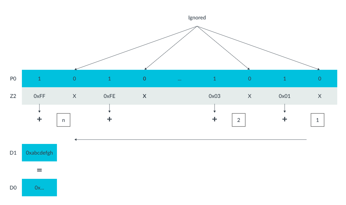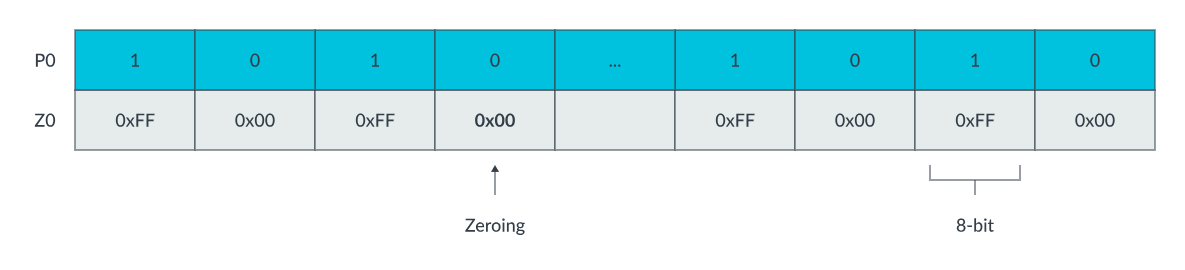 上述指令将带符号整数 0xFF 复制到 Z0,其中 Z0.B 的非激活元素将被设置为 0。