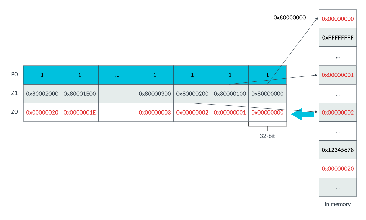 上述指令从由向量 Z1 的每个 32 位元素生成的基地址中加载有符号字节,放置到 Z0 中激活的 32 位元素中。