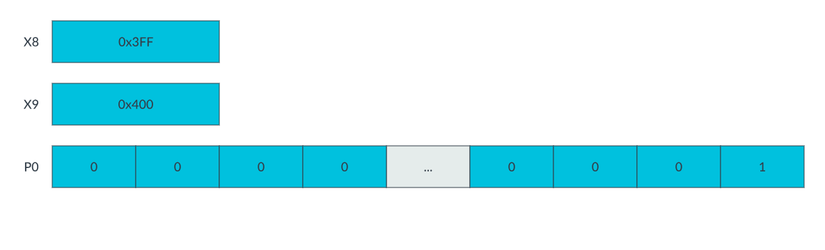 第一条指令生成 P0 中的谓词,从最低编号的元素开始为真,直到第一个无符号标量操作数 X8 的自增值大于等于第二个标量操作数 X9,然后变为假,直到最高编号的元素。