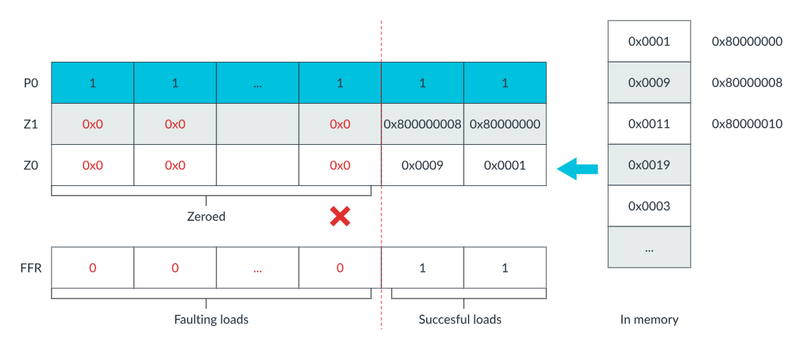 ),SVE 引入了首故障向量加载指令。为允许向量访问跨越无效页面,SVE 还引入了首故障谓词寄存器(FFR)。当使用首故障向量加载指令向 SVE 向量加载数据时,FFR 寄存器会更新每个元素的加载成功或失败结果。发生加载故障时,FFR 会立即标记对应元素,将其余元素标记为 0 或(谓词为)假,且不会触发异常。通常使用 RDFFR