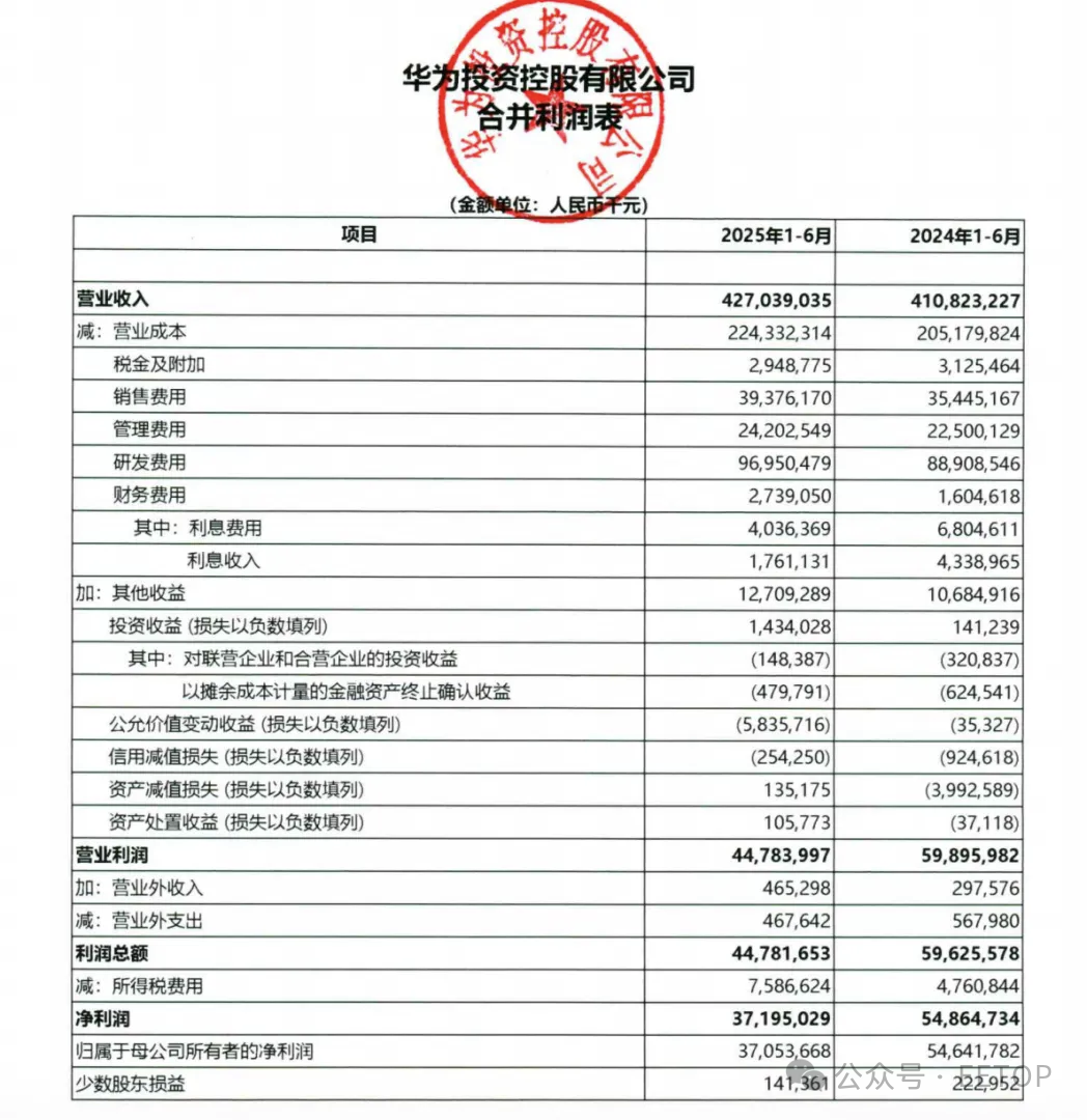 8 月 29 日,华为投资控股有限公司发布 2025 年半年度报告。报告显示,华为上半年营收 4270.39 亿元,同比增长 3.95%;净利润 371.95 亿元,同比下降 32%。研发投入 969.50 亿元,同比增长 9.04%,占营收 22.7%。从整体数据来看,华为虽然实现营收增长,但盈利能力面临不小压力。